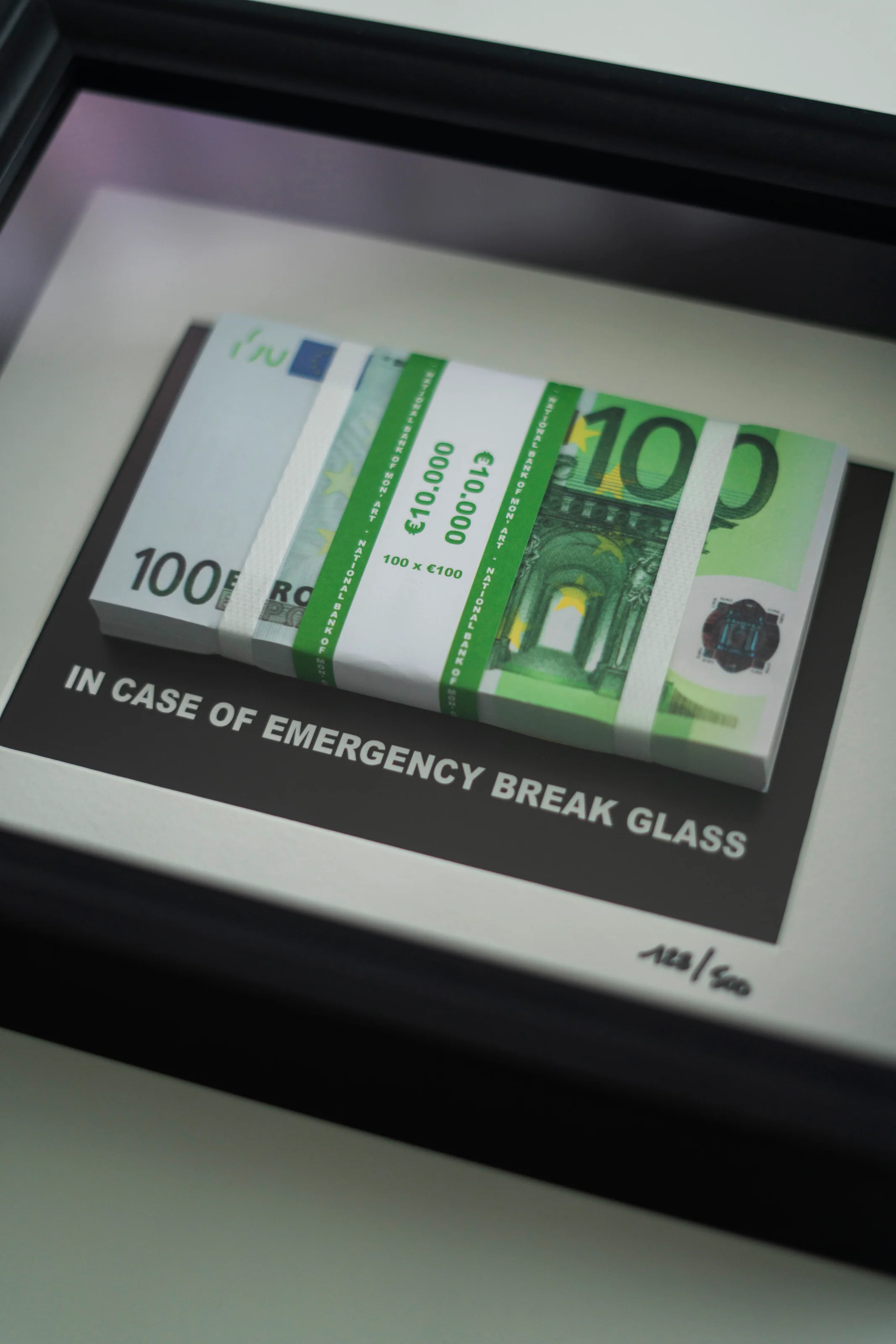 Emergency money that is! Real life size €100 bills, packed, ready to use, ready to spend in case of emergency. The luxury frame is made from black wood and has a size of 28,5cm wide on 23cm high. It has a very deep 6cm frame to give it that extra depth. Covered with a high quality plexiglass to give the artwork even more amazing looks. Real glass won't even be fun to ship as we would need to add glue to the box to fix the broken glass due to shipping.