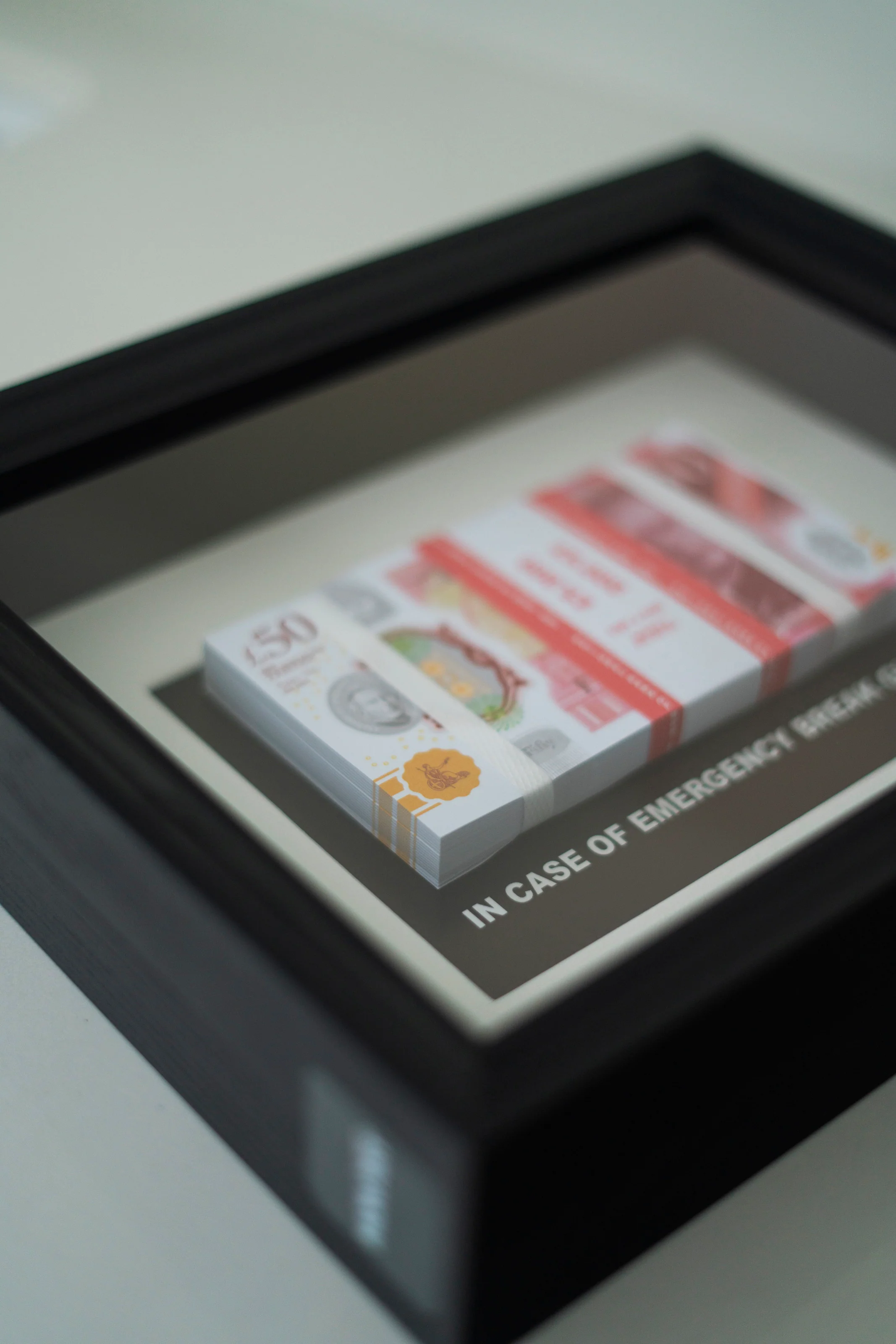 Emergency money that is! Life size £50 bills, heatwrapped so they stay fresh. The luxury frame is made from black wood and has a size of 28,5cm wide on 23cm high. It has a very deep 6cm frame to give it that extra depth. Covered with a high quality plexiglass to give the artwork even more amazing looks. Real glass won't even be fun to ship as we would need to add glue to the box to fix the broken glass due to shipping.