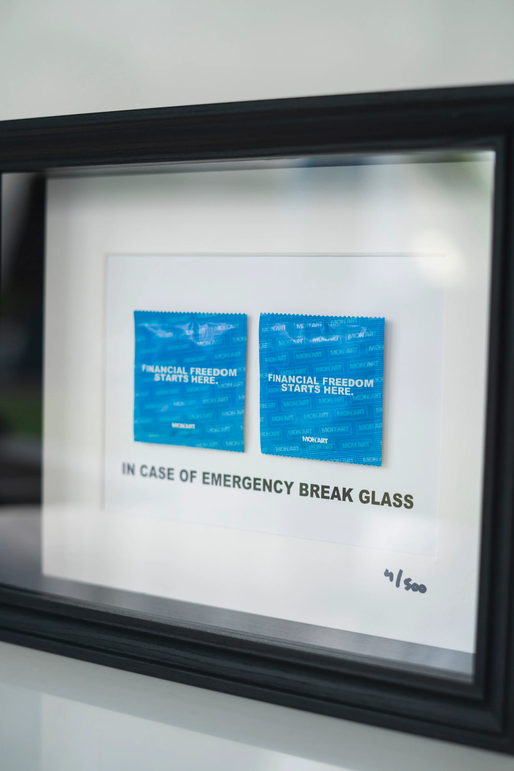 Elevate your decor with a dose of humor and practicality with our latest Mon'Art frame. This limited-edition artwork features two real condoms boldly branded with the phrase "Financial Freedom Starts Here" — a playful wink to the financial challenges of raising kids. Our typical "In Case of Emergency Break Glass" adds a touch of satire to the piece, making it a quirky and thought-provoking conversation starter.