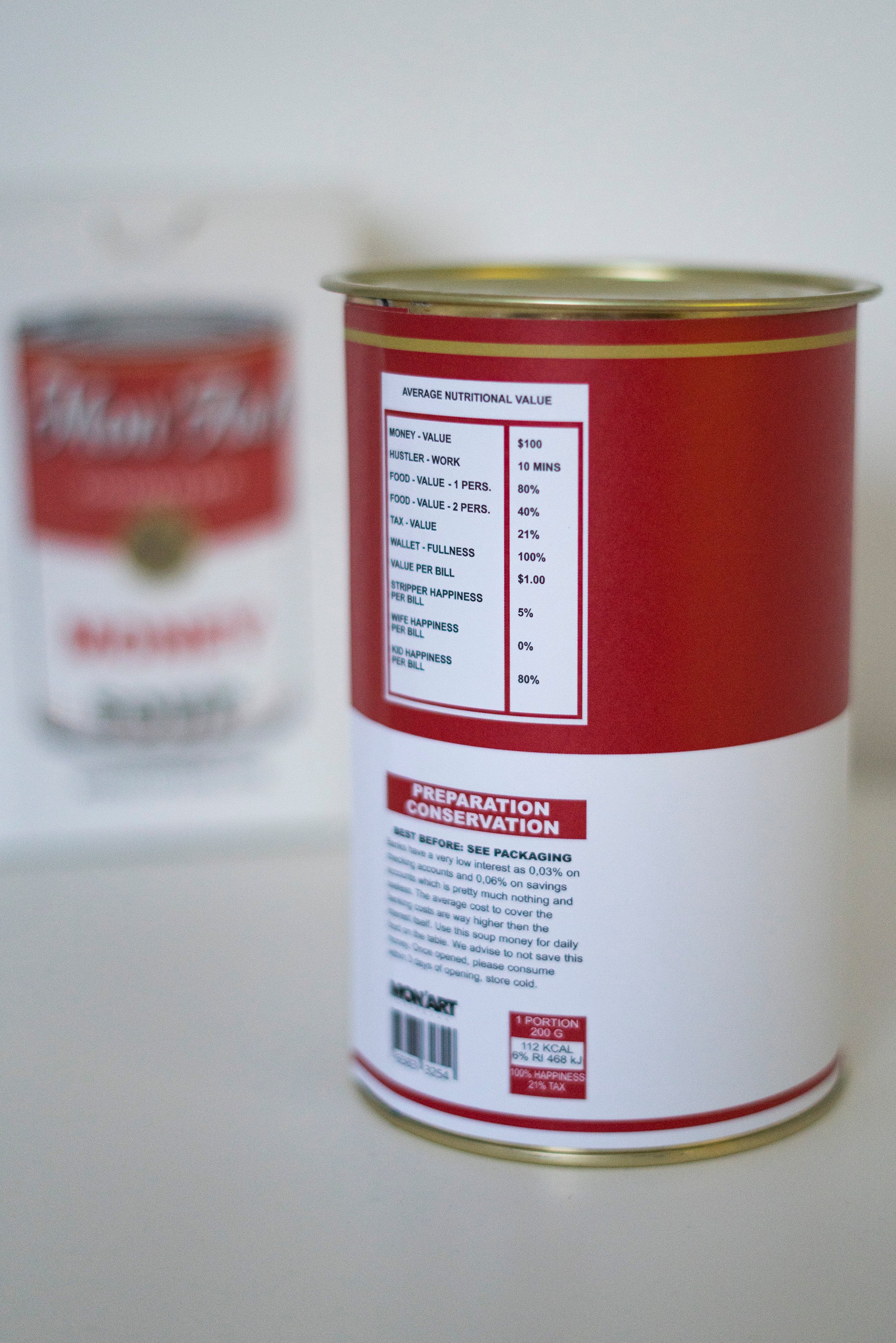 Inspired by one of the greatest artists all time, as in who doesn't know the Mr Warhol soup artwork. We decided to give it a little twist and create our own Money Soup piece! An actual soup can with money inside, $1 bills inside (no, not real ones), because we all need to eat, right? This piece will look just awesome in your living room or on your desk! This piece comes with a certificate of authenticity and comes in a box, specially made for this piece. The can and stack inside are all sealed. Of course we've protected the piece so it arrives in 1 piece to you!Ā Ā