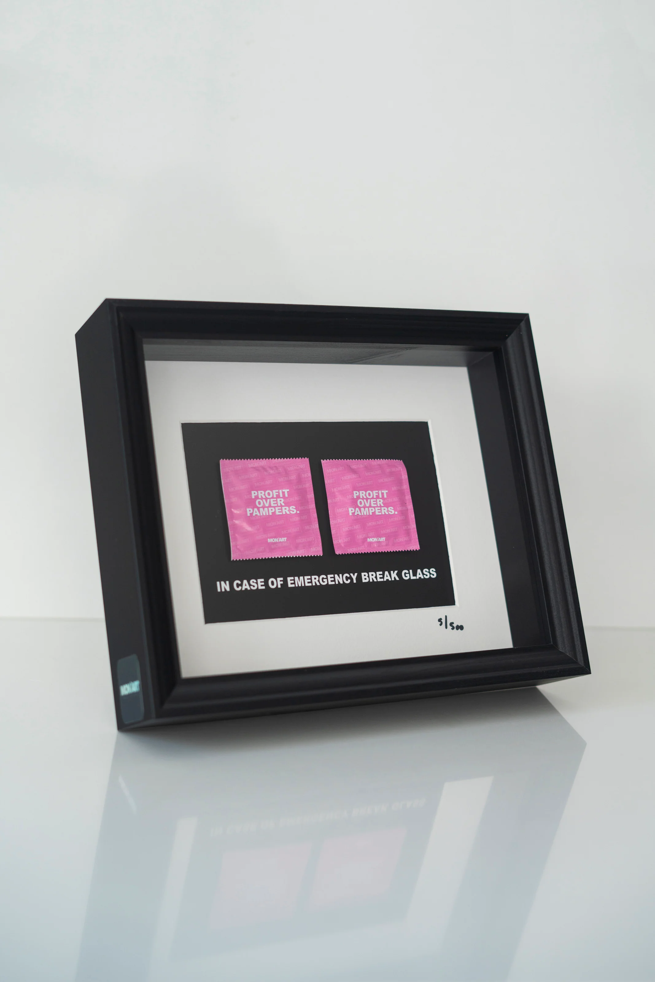 This limited-edition piece features two real condoms, humorously with the phrase "Profit Over Pampers" — a cheeky wink to the financial realities of parenthood. As we love satire, we've added our typical "in case of emergency break glass" phrase.Â