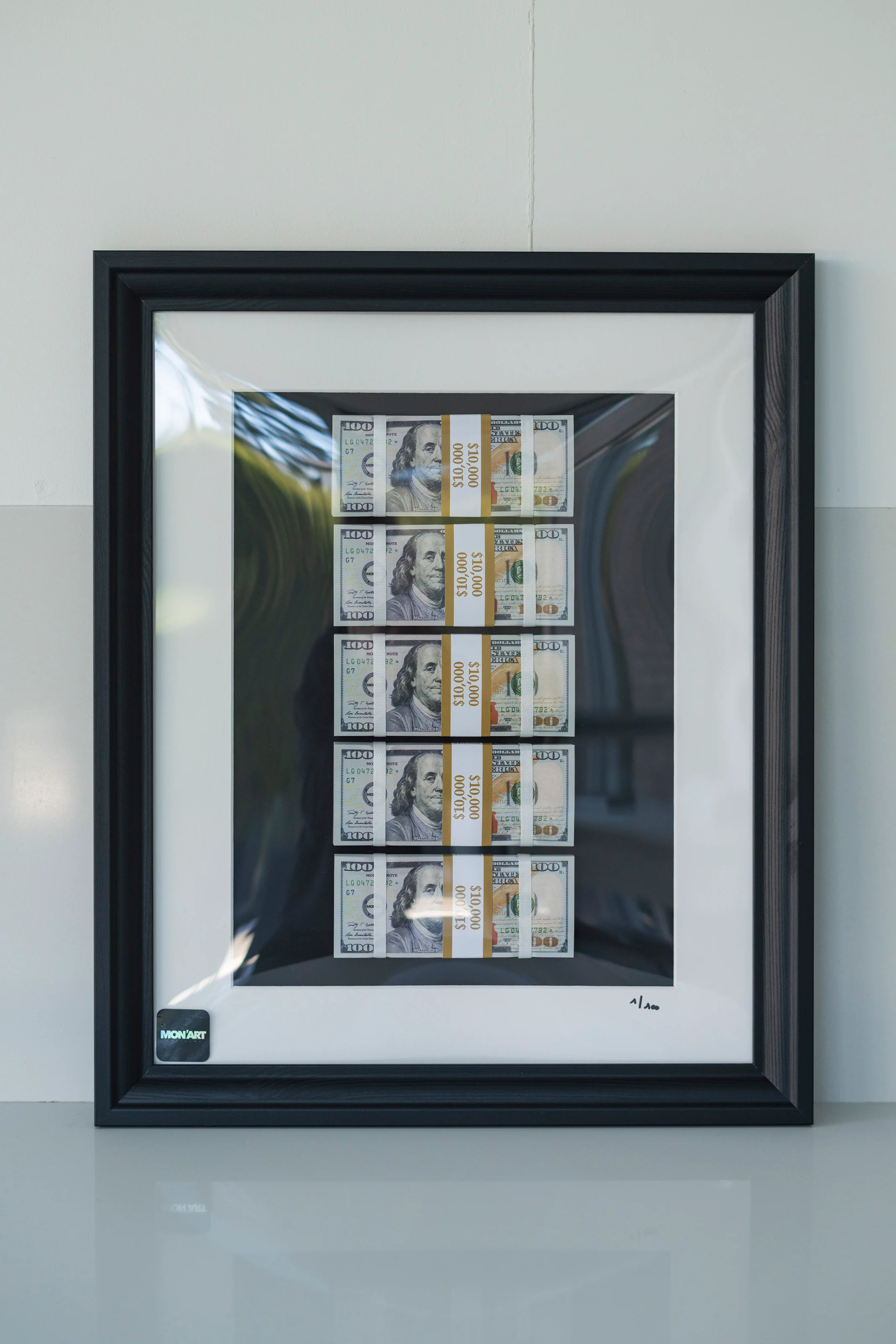 It'sĀ basically what the title says, $50.000 in a black wooden frame but a series 3 as the firstĀ series sold out. We upgraded the frame to a more fabulous one and added the straps for a more real look.