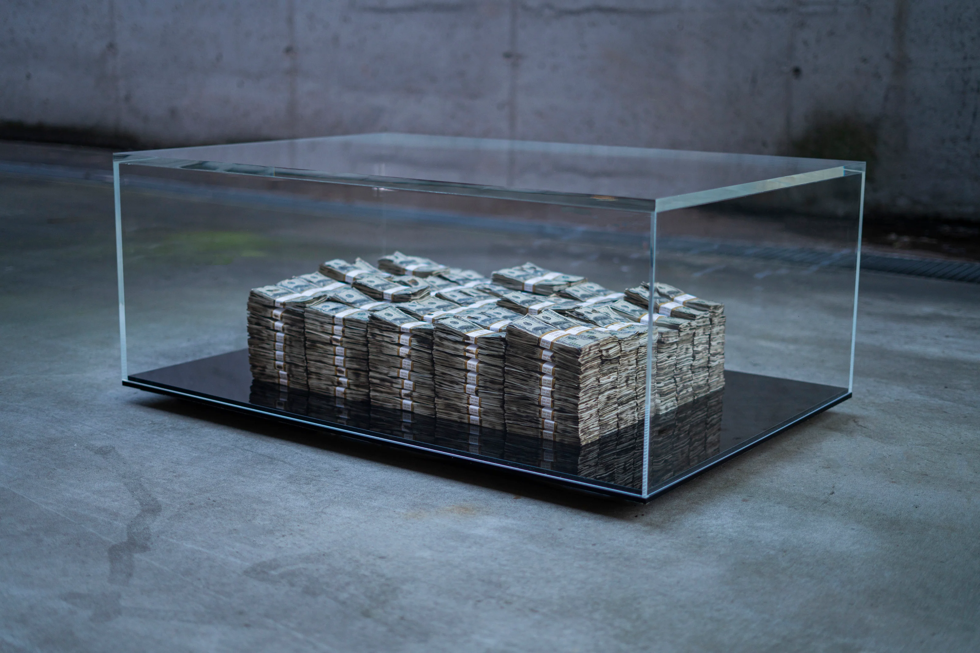 We saved this money from an old bank which has been set on fire back in the day! Decided to strap all stacks again and put them together as this awesome table!